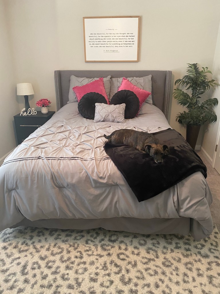 It was so much fun for me to give our guest room a refresh. (we actually had furniture in there from 1996!) I knew I wanted to go with a girly/glam look but also make it comfortable for all visitors. So I went with black and gray with a few pops of pink.